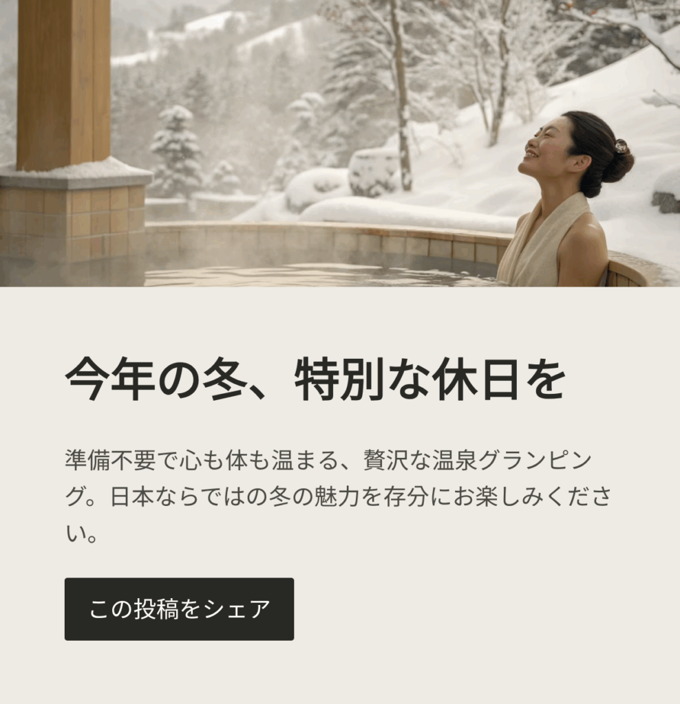 今年の冬は、面倒な準備から解放され、身も心も温まる「温泉グランピング」で、特別なひとときを過ごしてみてはいかがでしょうか。