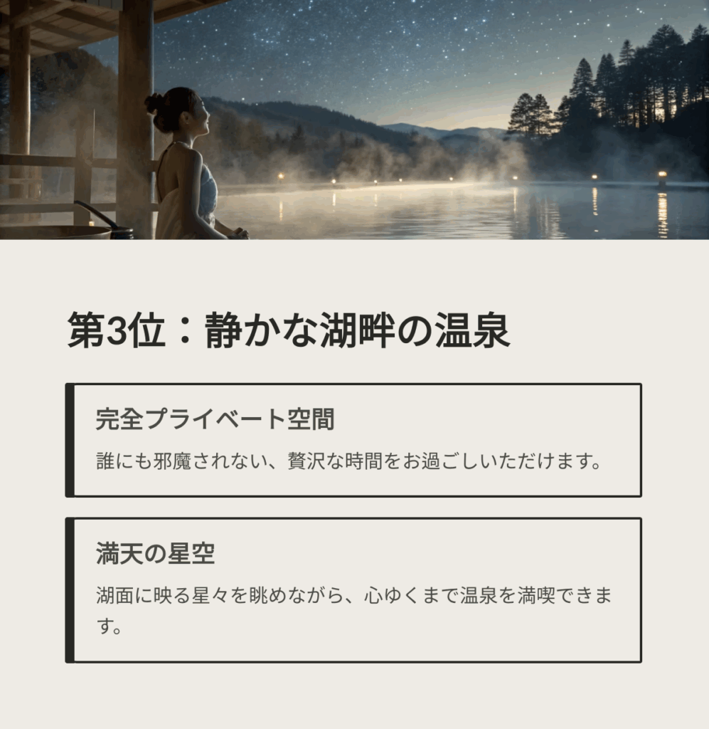 【第3位】静寂な湖畔で楽しむ「プライベート温泉」