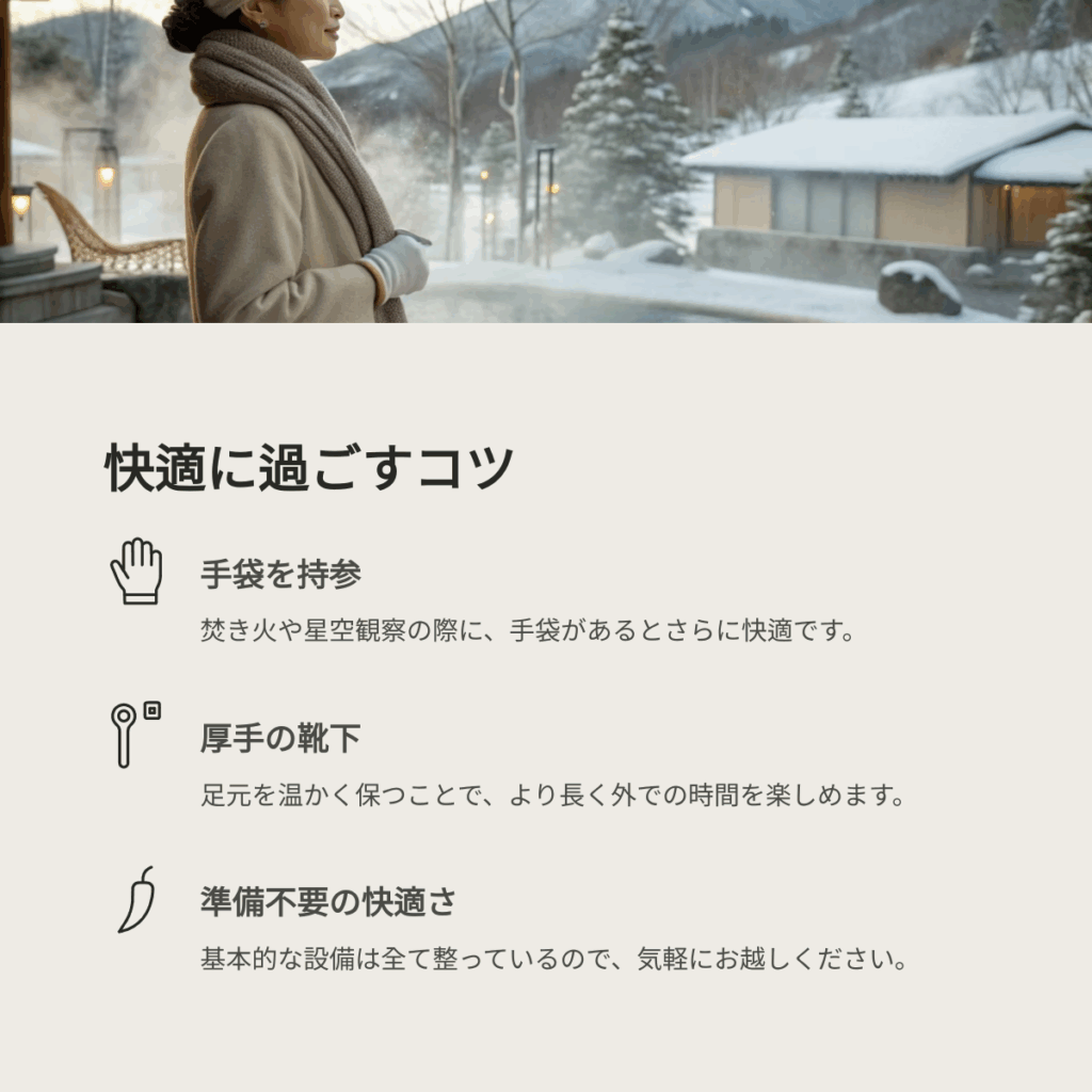 施設内は非常に暖かいですが、温泉とテントの移動時や、夜に星空を眺めるときのために、最低限の備えはあると便利です。