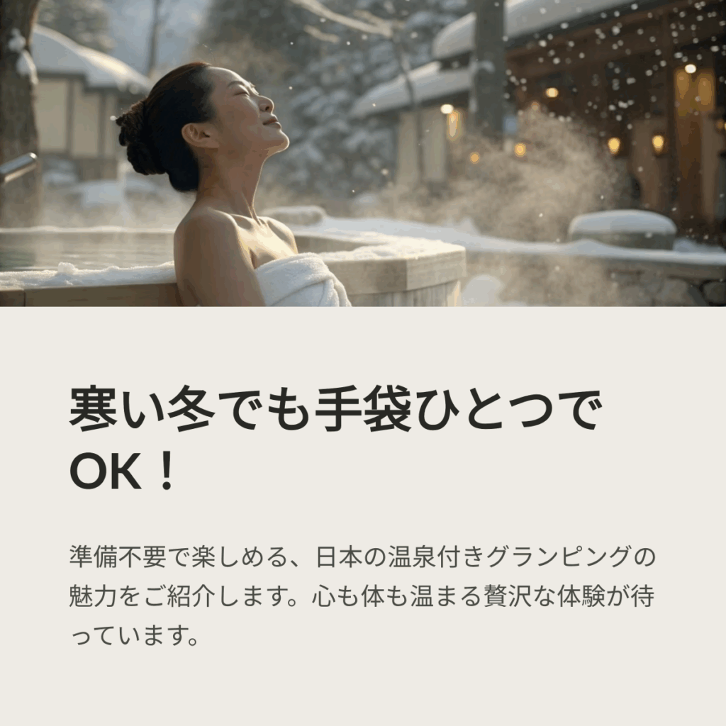でも、もし「手袋ひとつ」持っていくだけで、豪華なキャンプ体験と体の芯から温まる温泉を同時に楽しめるとしたら、いかがでしょうか。