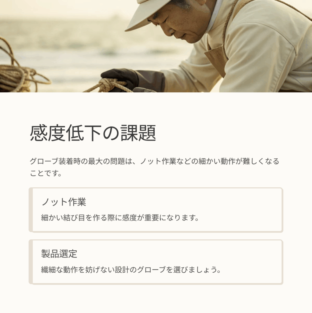 ・作業性の悪化: ノット(糸結び)やルアー交換などの細かい作業が困難になる。