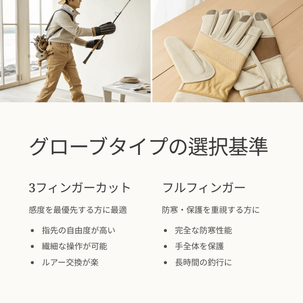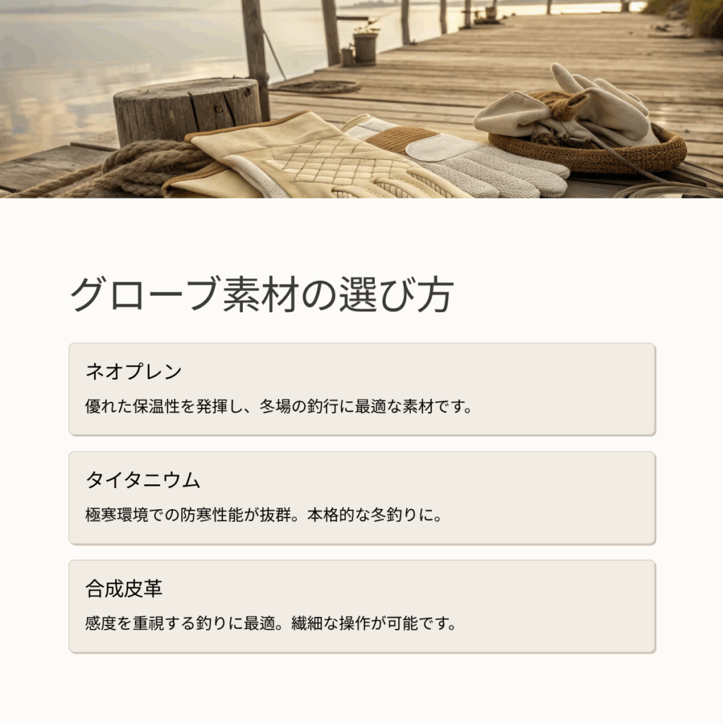 素材の特性(ネオプレン、タイタニウム、合成皮革)、機能性(防水・防風)、そしてタイプ(フルフィンガー、3フィンガーカット)を正確に理解し、ご自身の釣りスタイルに最適な一品を選定することが不可欠です。