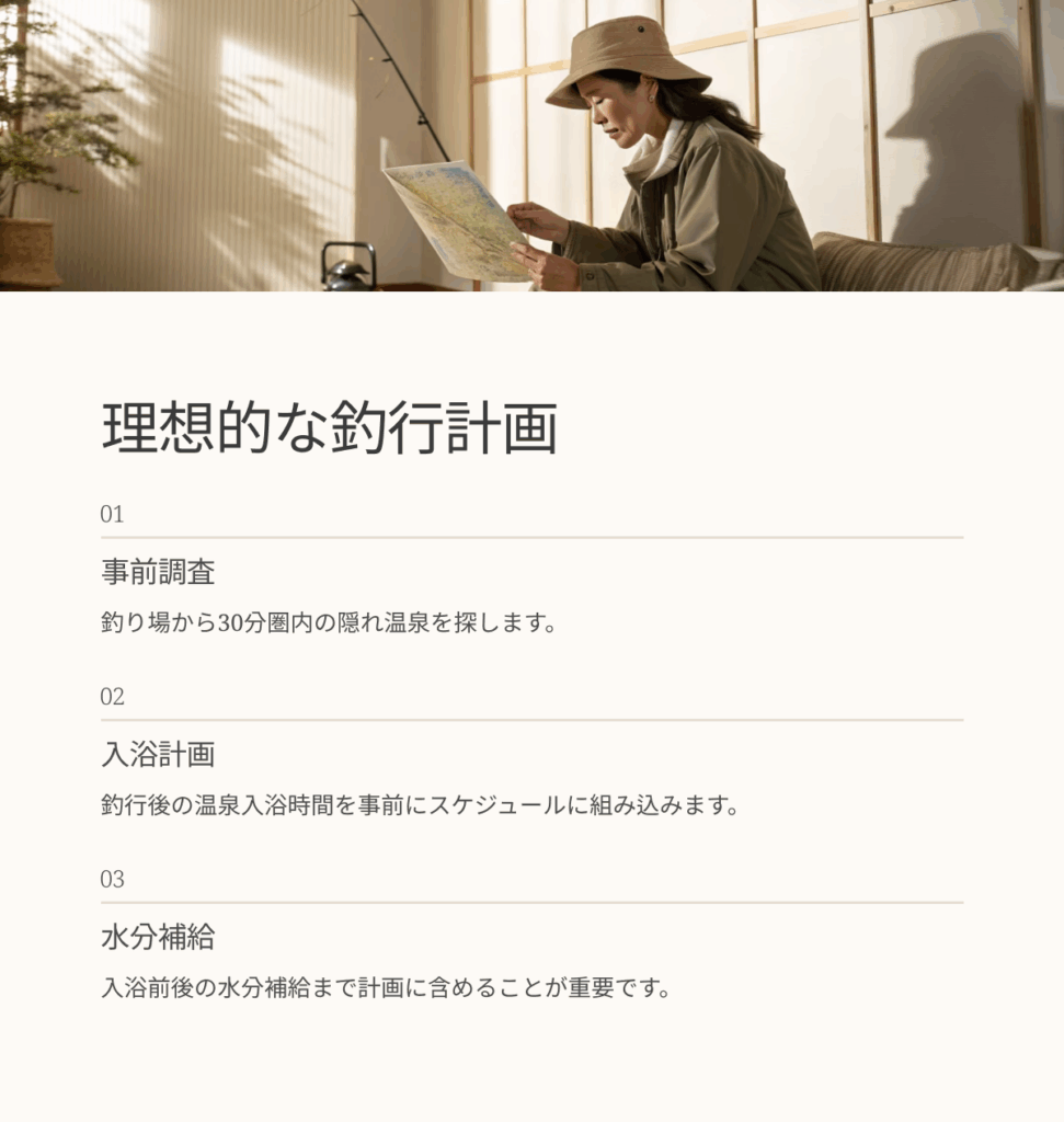 最後に、釣りと温泉をシームレスに繋ぎ、1日の満足度を最大化するタイムスケジュールを構築します。