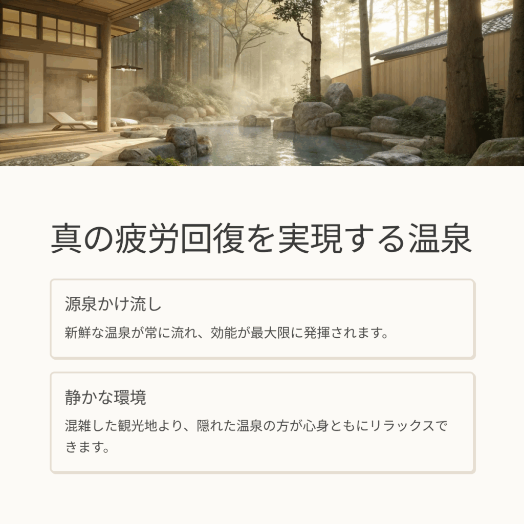 結論として、純粋な「疲労回復」と「精神的リラックス」を追求するならば、アクセスや施設の利便性を多少犠牲にしてでも、「源泉かけ流し」で「静かな」隠れ温泉を選ぶべきです。