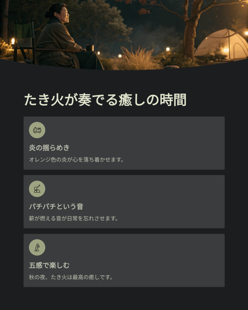 秋キャンプの魅力ポイント 肌寒さの中の「温かさ」が、心の底からリラックスさせてくれます。 |