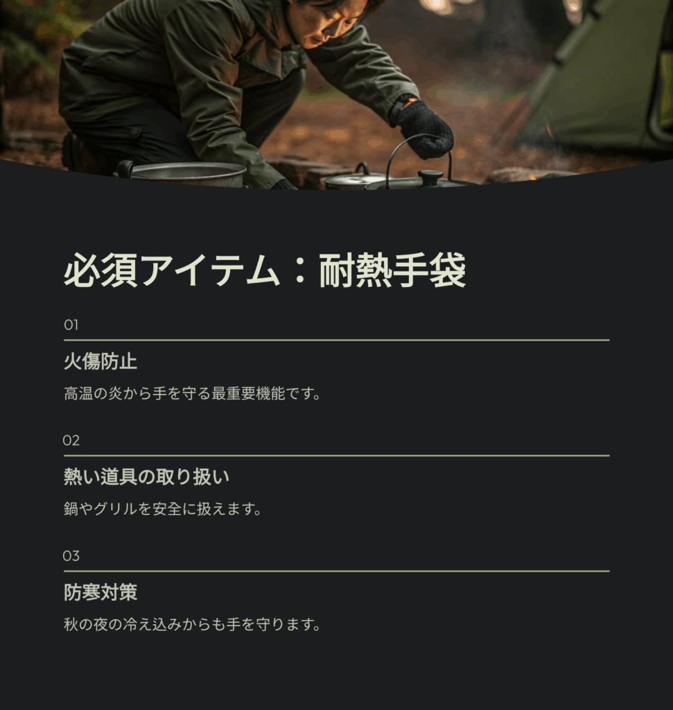 | たき火用品 | たき火台、耐熱手袋、薪 | 乾燥した薪を準備することが重要です。 |