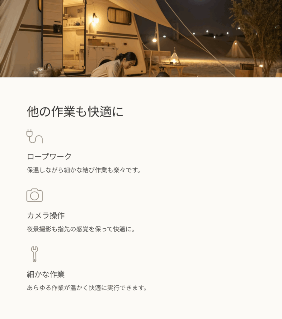 手の甲の暖かさを保ちながら、ランタンの点火、焚き火の準備、そして温かいコーヒードリップまで、すべての精密作業を可能にしてくれます。