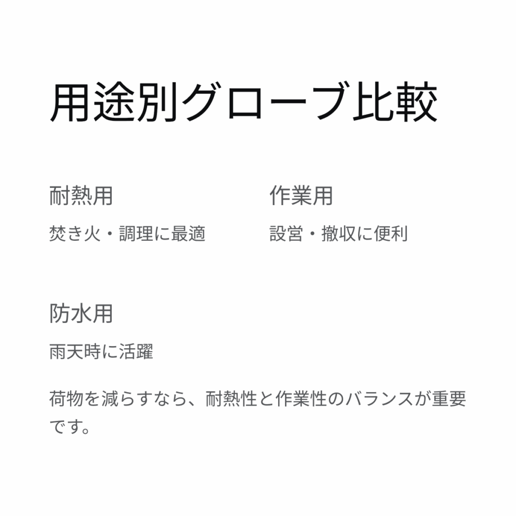 | 薄手グローブ(防水・防寒) | 洗い物、雨天時、防寒 | 濡れや寒さを防ぐが、熱や怪我には弱い。 |