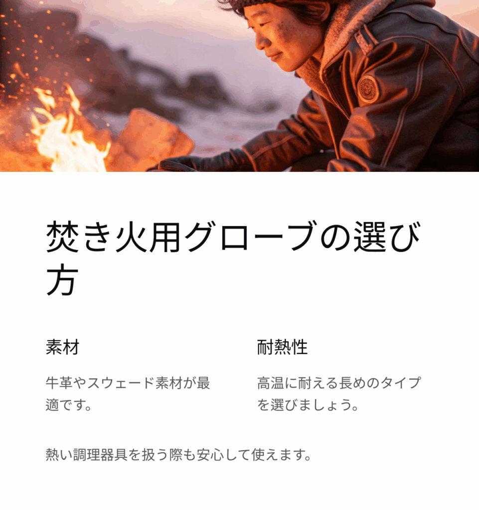 | 耐熱グローブ(革製) | 焚き火、調理 | 熱に強いが、細かい作業は苦手。 |