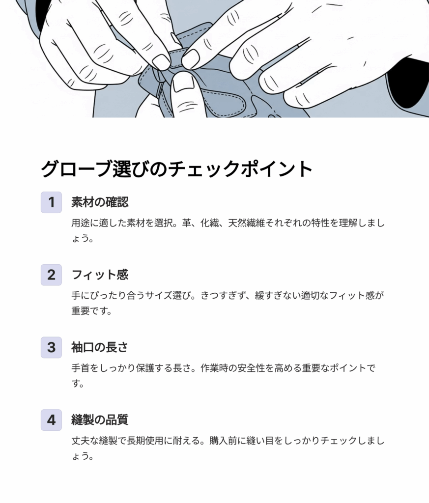 - 素材(Material):用途に合った素材か?(例:耐熱グローブは牛革、作業用グローブは合成皮革など)