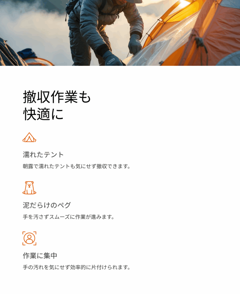 - 濡れた装備の撤収:冷たさや汚れから手を守ります。