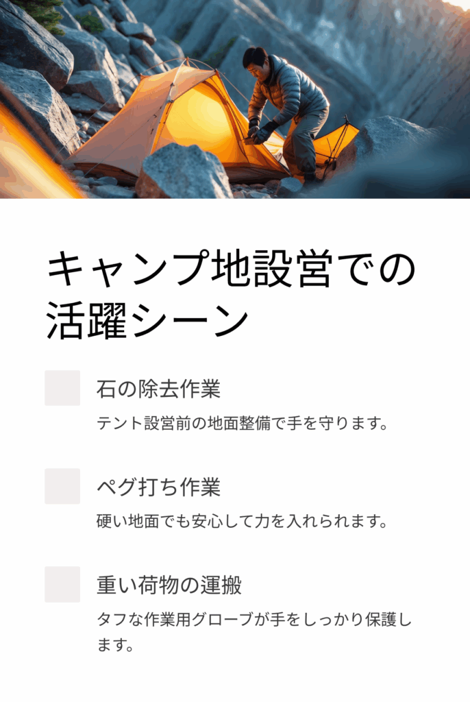 - ペグダウン:ハンマーや石でペグを打つ際の手を保護し、滑りを防ぎます。