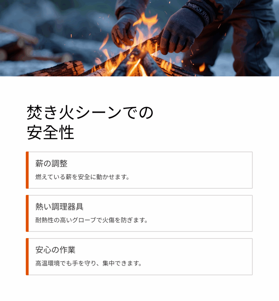 作業用グローブの圧倒的メリット ・耐熱性・耐火性:焚き火や熱い調理器具を扱う際に火傷を防ぎます。 |