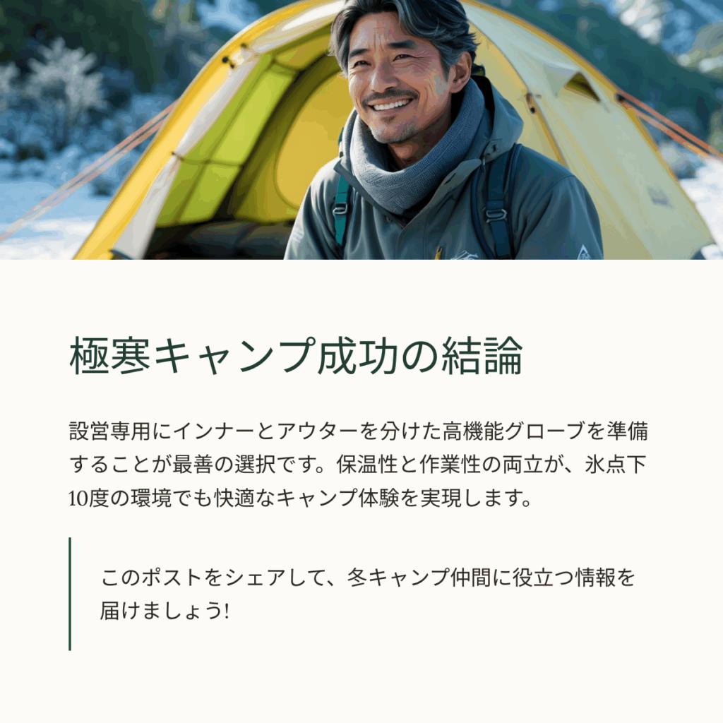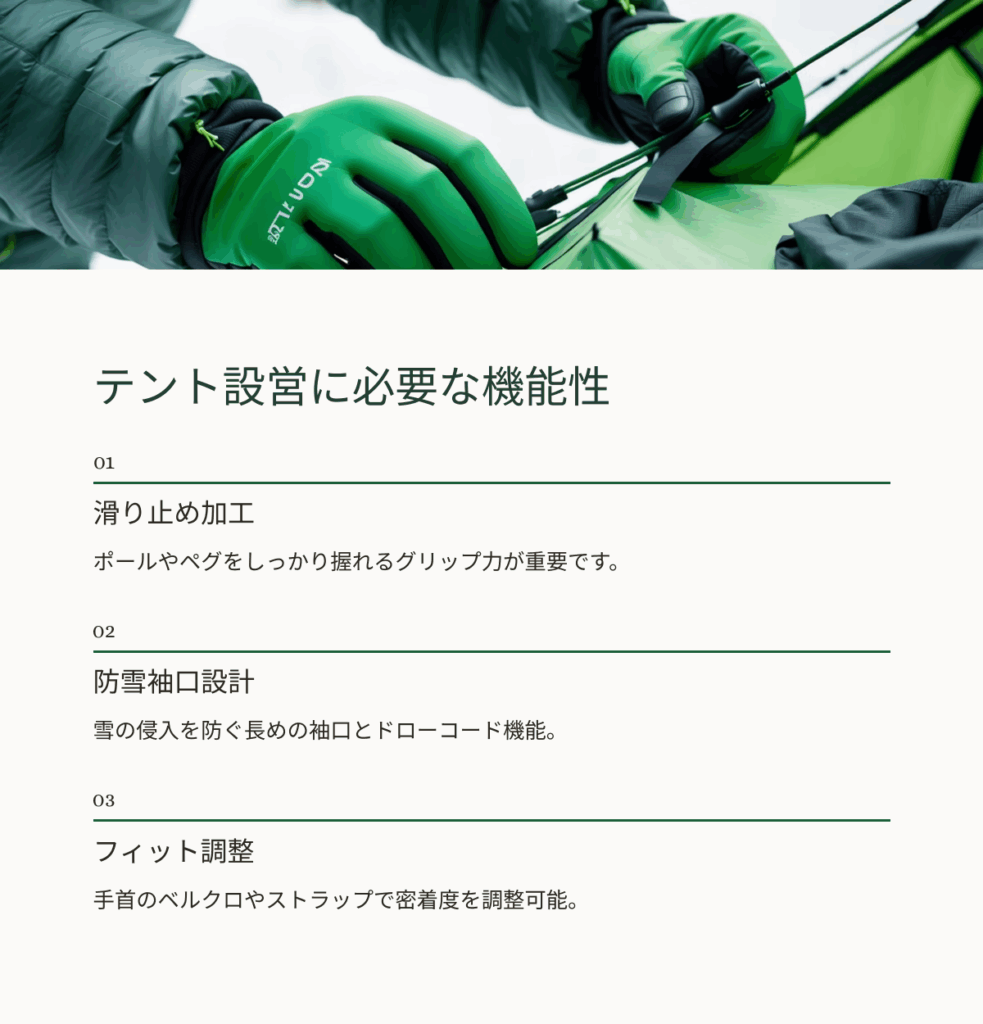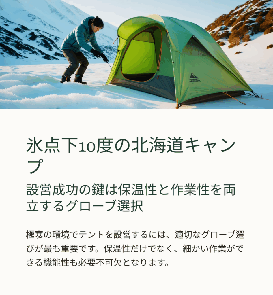 極寒地でのテント設営において、グローブの性能は単なる快適性を超え、作業の安全性と効率に直結します。