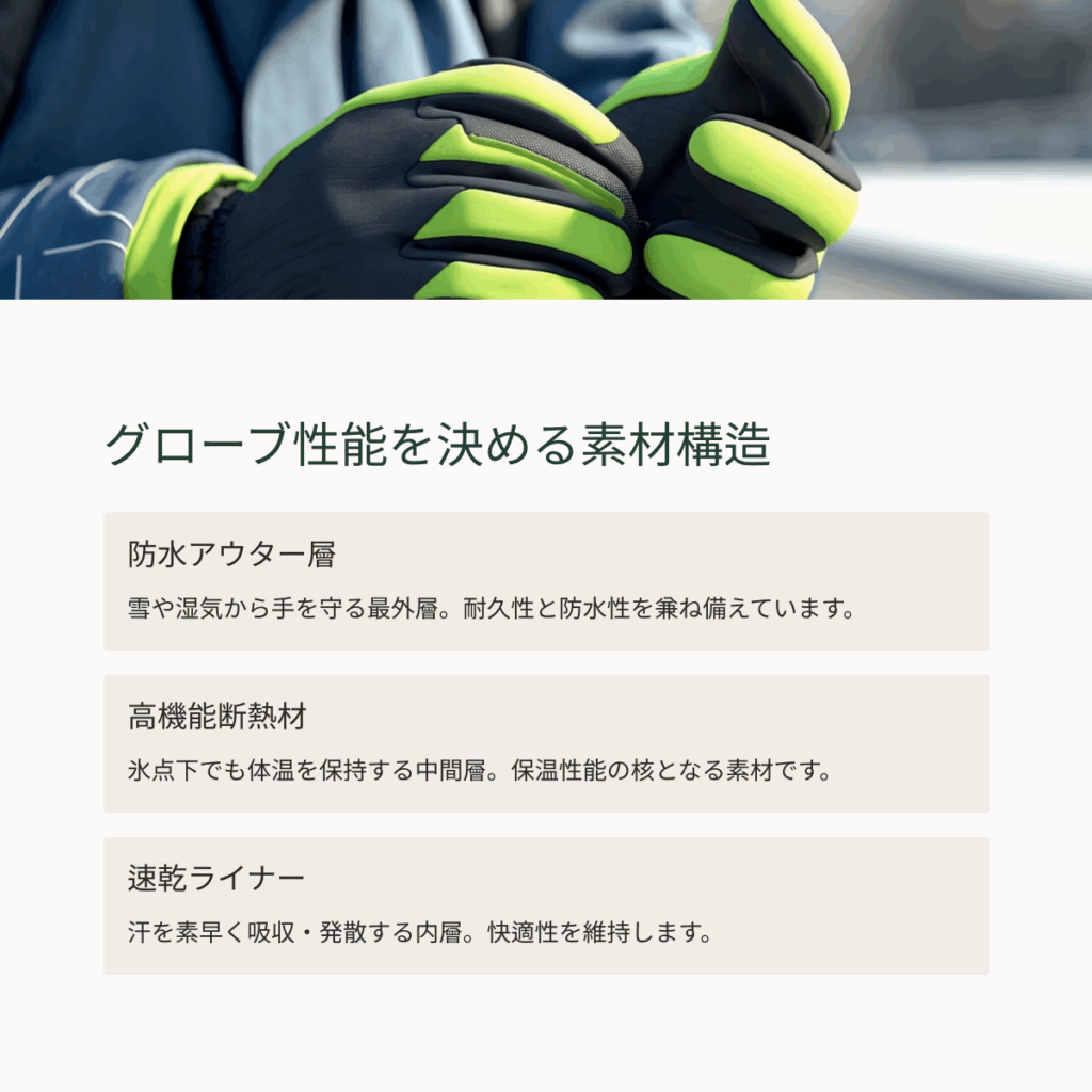 特に、指の自然なカーブに合わせた「立体裁断」は、ポールを握る、ジッパーを操作するといった細かい作業の精度を大きく左右します。
