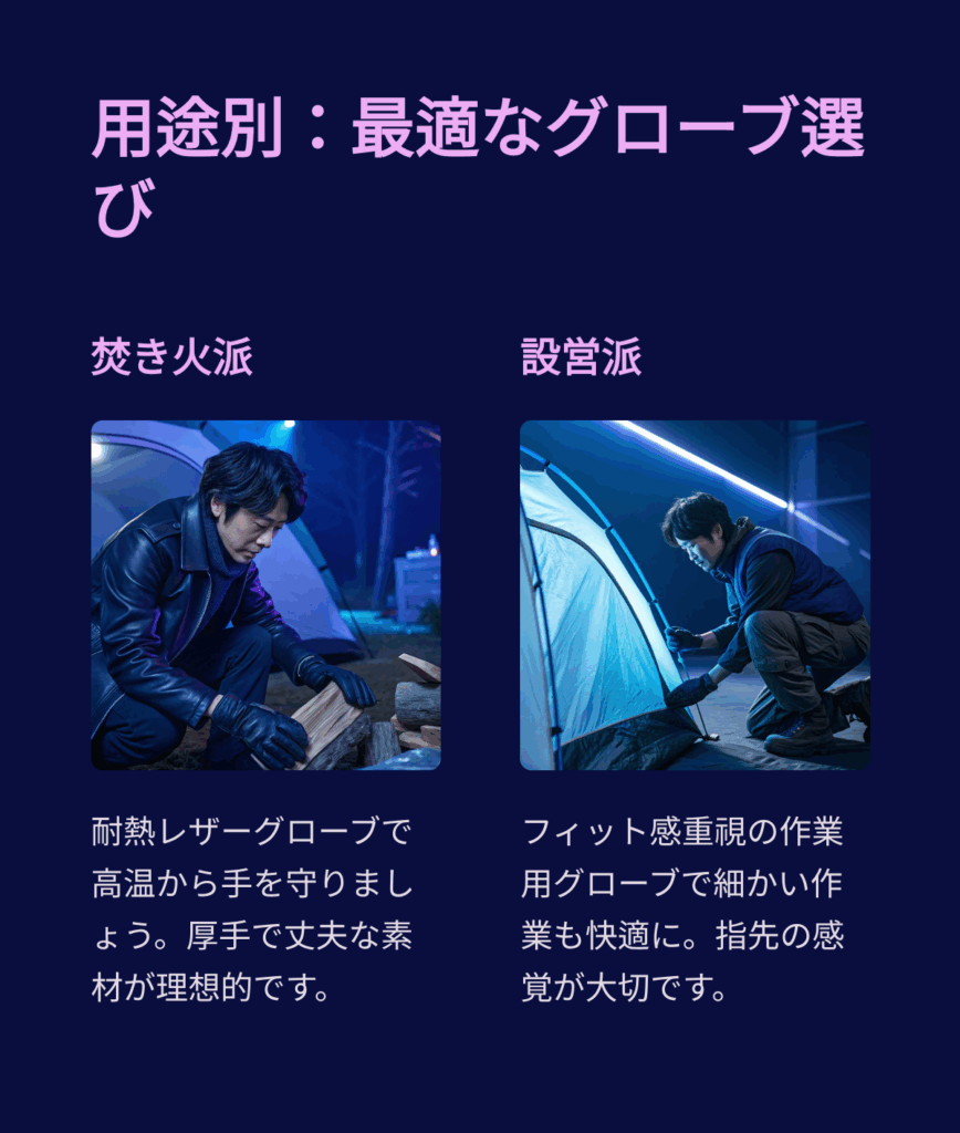 完璧なグローブを一つだけ見つけるのは難しいかもしれませんが、用途に合わせて2〜3種類を使い分けるのが、実は上級キャンパーへの近道です。