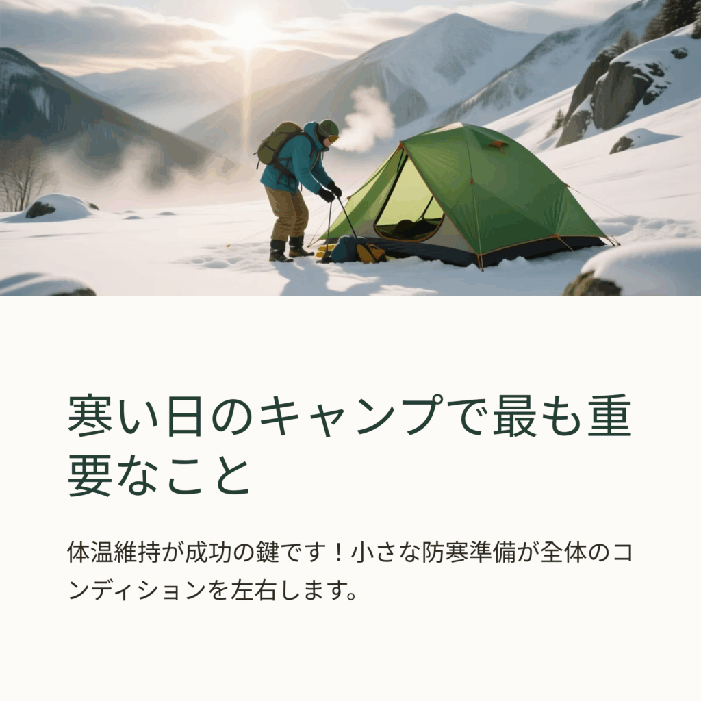 キャンプ準備のポイント 肌寒い季節のキャンプで最も重要なのは、まさに「体温維持」です。 |