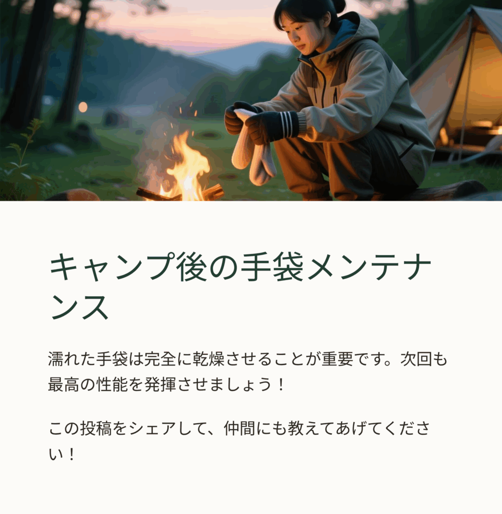 今日ご紹介したように、選び抜かれた一つの手袋があなたの手を守り、ひいてはキャンプ全体の満足度を高める重要なアイテムとなり得ます。