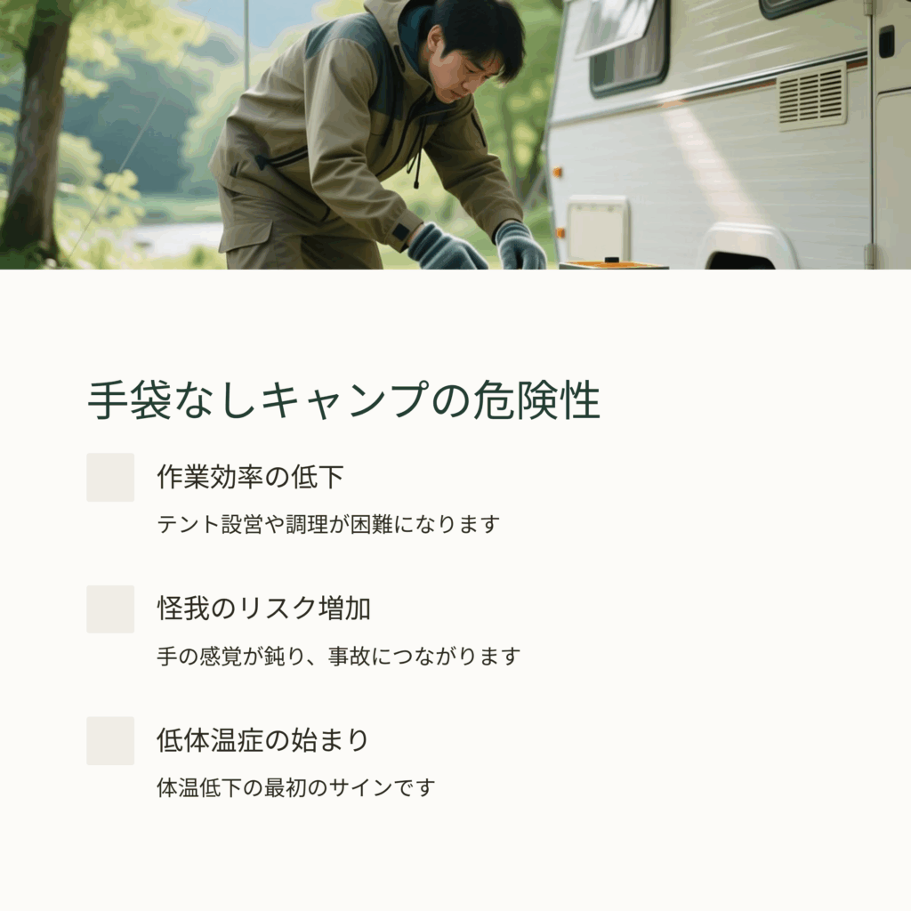 単に手が冷たいという問題だけでなく、安全なキャンプ活動に必須の装備であることを、ぜひ覚えておいてください。