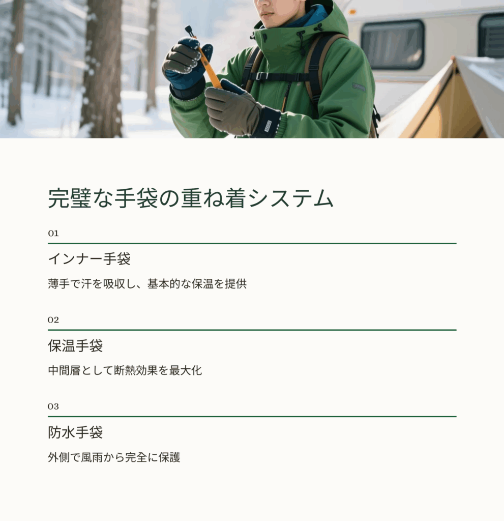 「レイヤリング(重ね着)」の原則を手袋にも適用し、保温性と活動性の両方を確保することが望ましいです。
