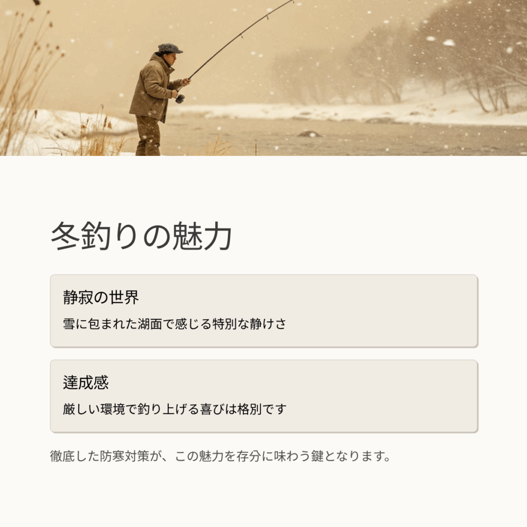 - 極寒の中で釣り上げる一匹の感動: 寒さに耐えて得られる釣果は、喜びもひとし오です。