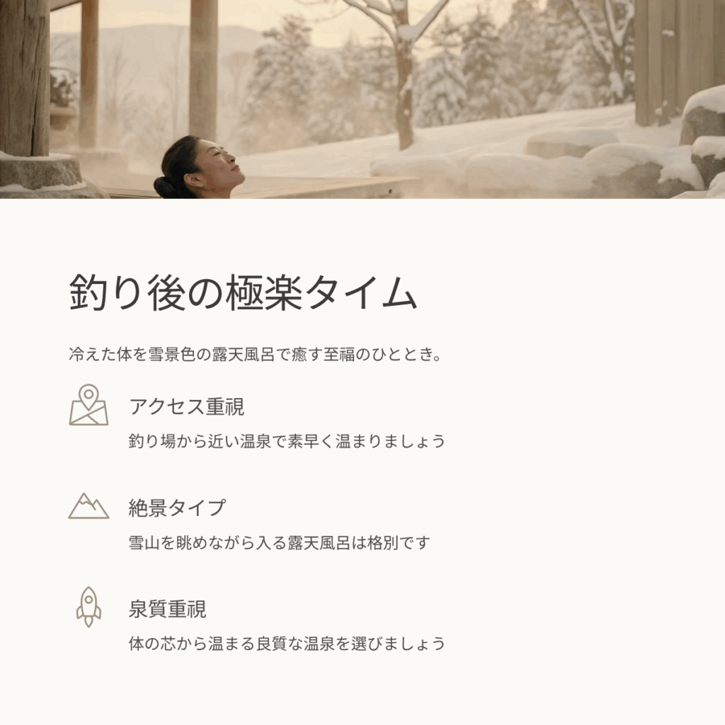 どのタイプの温泉を選ぶにしても、釣りの後の冷えた体で入る露天風呂の感動は、言葉にできないものがあります。